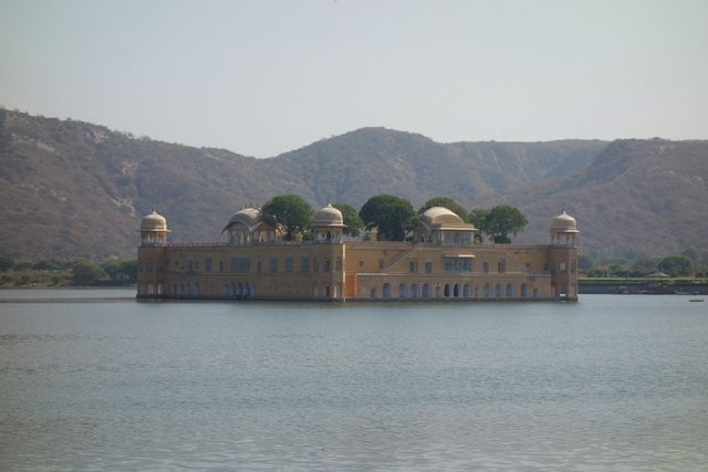 咦,天下紅雨了?怎麼如此貼心。我驚訝地點了頭,下車走到湖畔,這應該是曾在別人遊記看過的「水之宮殿」(Jal Mahal),植了許多綠樹的四方建築,每面的中央弧頂浮凸,四角立著飾亭,卻孤立在遙遠的湖中心。據說它原本也是王室的獵宮,只因後來附近築了水壩,下面四層被淹沒在湖水裡。不曉得現在水下的部份如何了,頹坍的遺跡雕像散在岩沙間,魚兒穿游,應該也頗有美感。