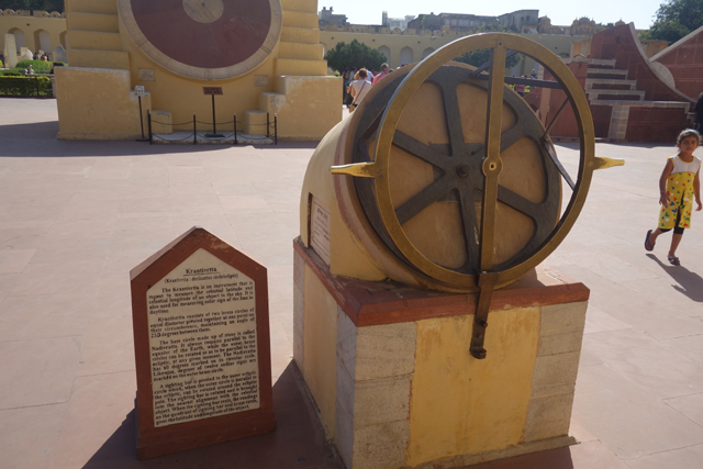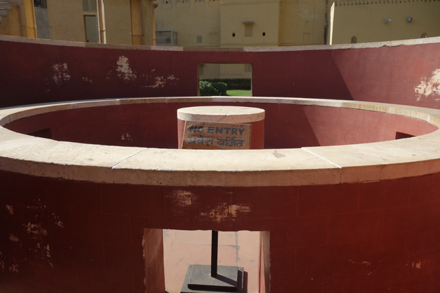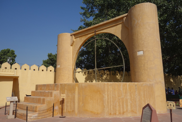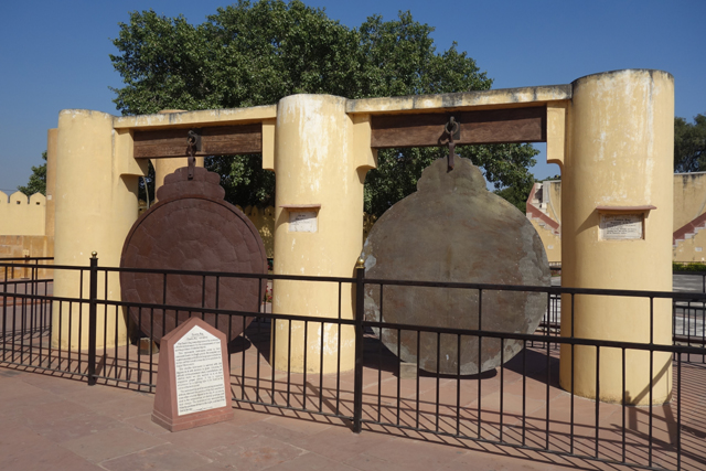 至於附近的「Yantra Raj」,樣貌更奇詭,是兩個銅鑼。走近說明板讀了讀,原來是可追溯至中世紀的星盤,由於「Sawai Jai Singh II」大君對這東西相當感興趣,特別研究許多典籍將其復現。不要看它髒髒鏽鏽,其實盤上細細密密刻了很多環線,說明板也把它的功能寫得天花亂墜,似乎光這兩片,便可推知白天黑夜的精確時間,也能看出星體位置,彷彿園區其他座都是研發心酸的。
