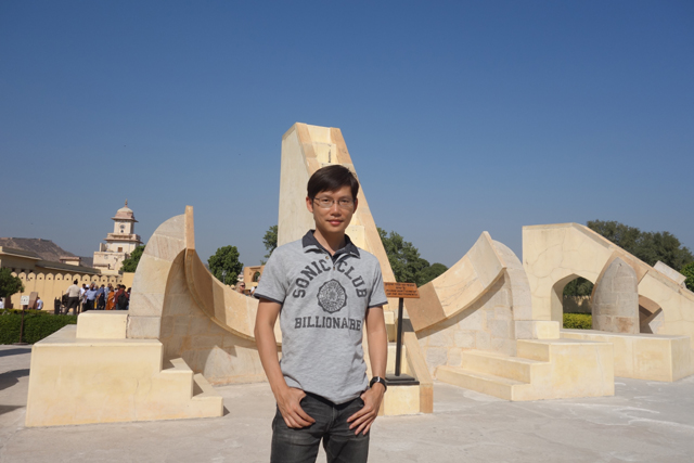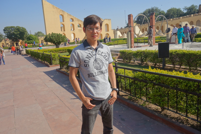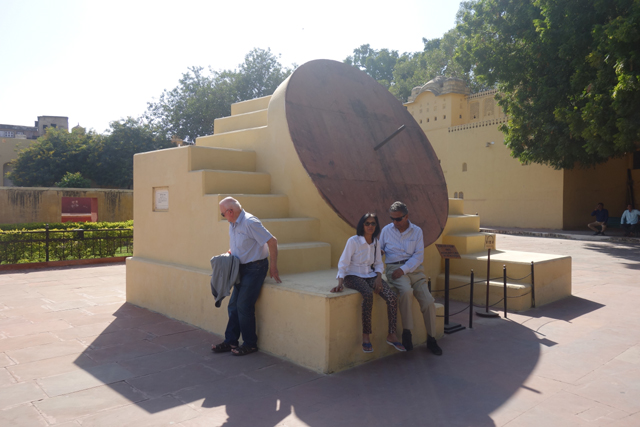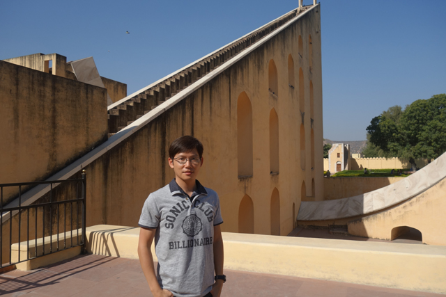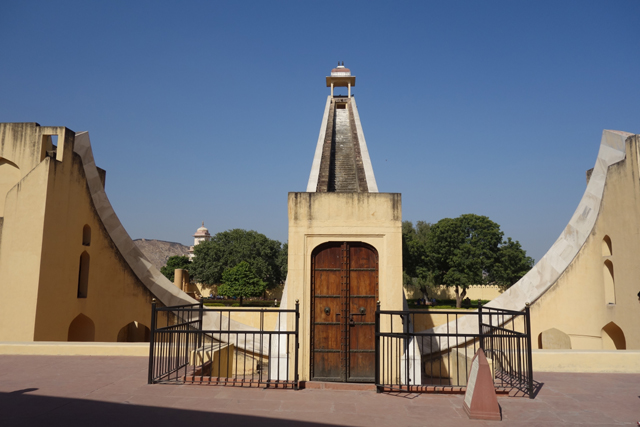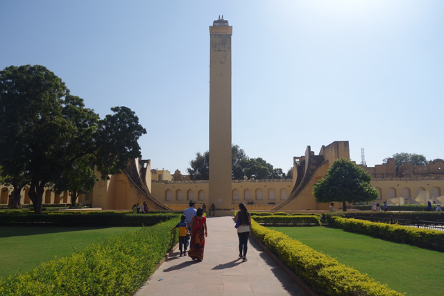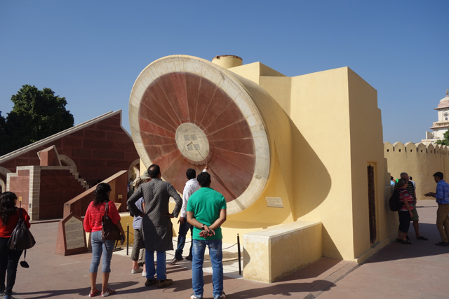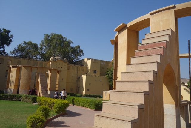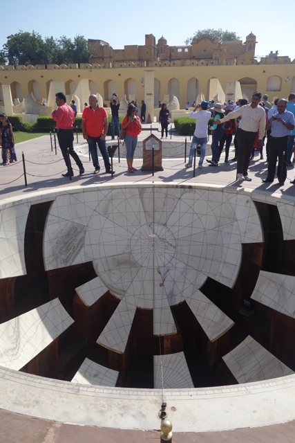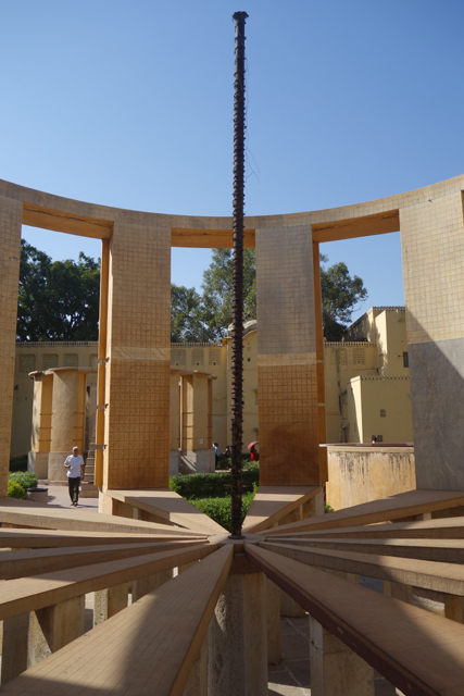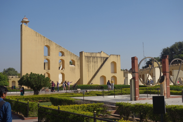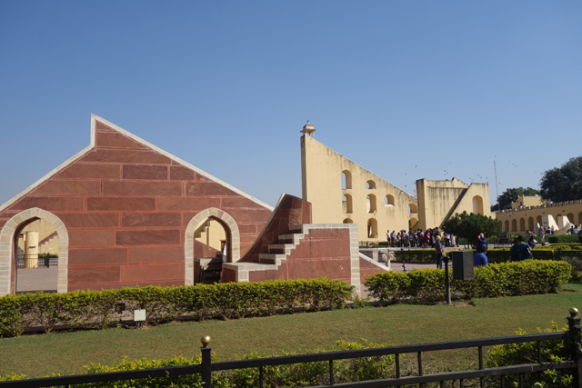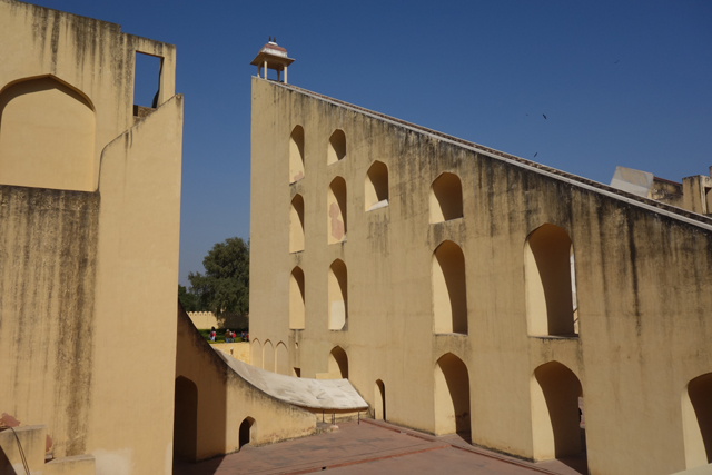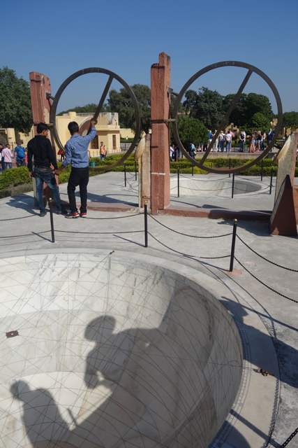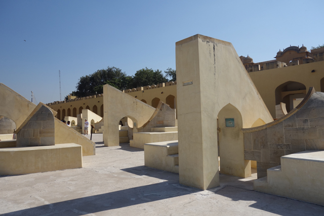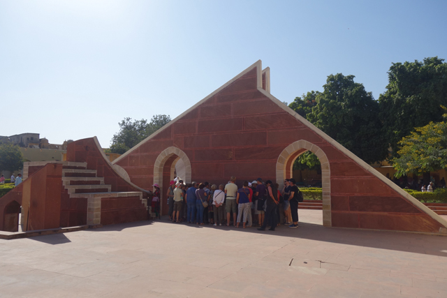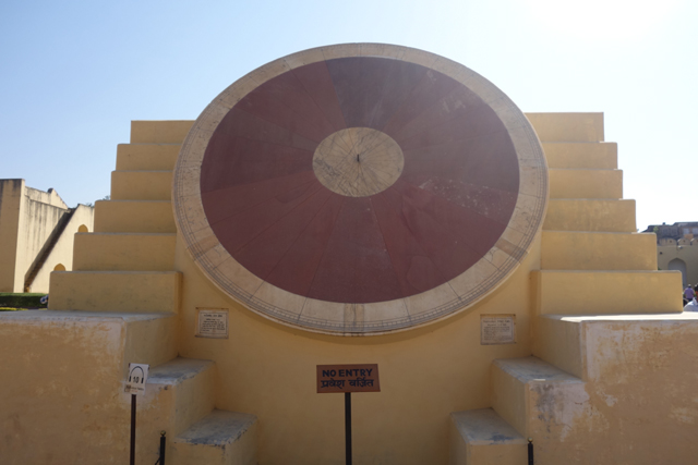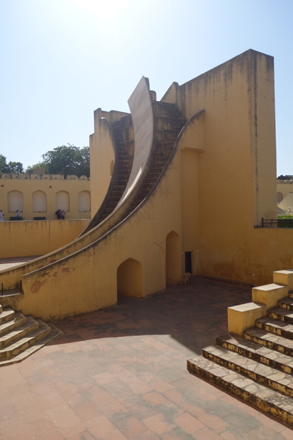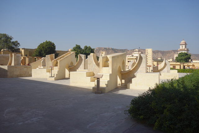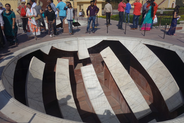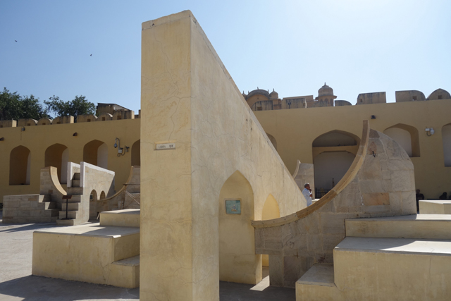 反正就是當抵達下午的第一個景點「姜塔曼塔天文台」(Jantar Mantar),太陽已經又西移了一大步。匆匆買好票走進大門,散佈在園區裡的是各樣奇詭塊體,不見大型望遠鏡,也沒有渾天儀那種球狀模型。這些奇妙建物皆出自將都城從「琥珀堡」遷至「齋浦爾」的「Sawai Jai Singh II」大君,身兼物理、數學及天文學家的他,在包括德里的五個地點都建了天文觀測所,「齋浦爾」這邊的是最大的一座,也因此被列名世界文化遺產。