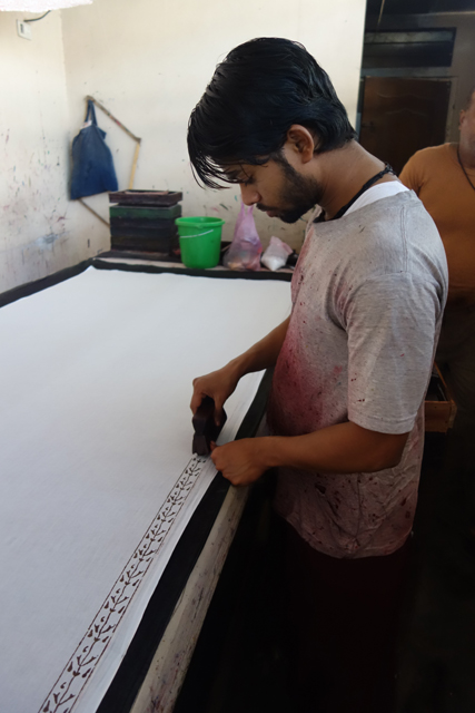 從「琥珀堡」回到「齋浦爾」市區,已經下午一點,午餐自然又免了,幸好我有先見之明,早餐在飯店盡量把肚子塞得飽飽。可是眼看下午行程極有可能受到耽擱,胖大叔居然還想帶我去看這裡很特別的印花染布。欸,我只喜歡看古蹟,不愛Shopping,不要擅自加碼啊。而且雖說純粹想讓我見識,沒買沒關係,哪個地方的導遊不是這樣包裝….