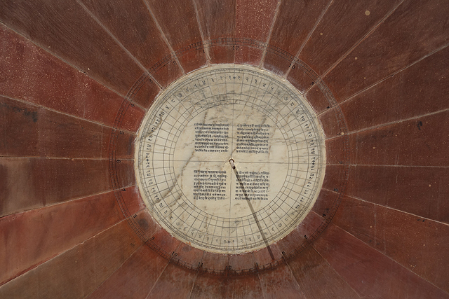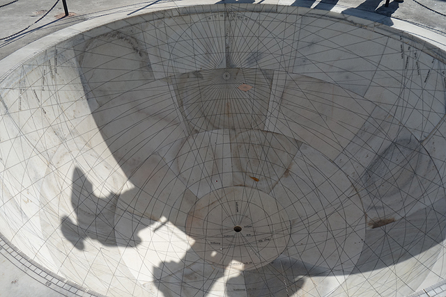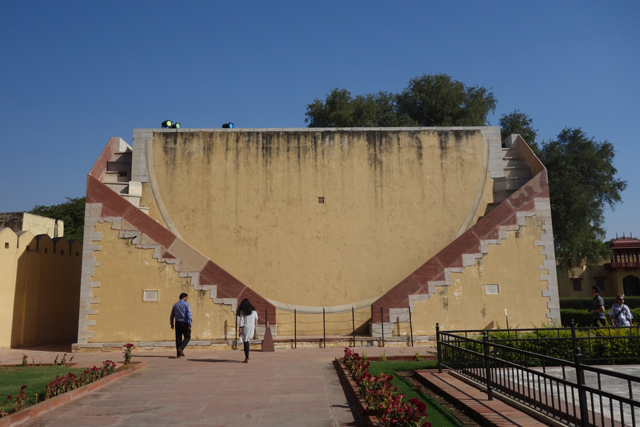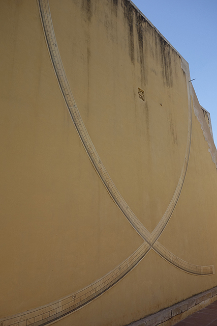從這面牆折往南,同一條子午線切去的就是園區最醒目的「Vrihat Samrat Yantra」。如同字面上的最大最高之意,這座直角三角形的牆斜上攀升27公尺,角度27度對應著此地的緯度,兩側弧形展翼,形構成一座巨大的日晷。當太陽挪移,高牆在弧形刻盤烙下的陰影也隨之縮張,讀出的數值可精微至兩秒。終於遇到如此淺顯易懂的測量儀,很增加自信心,我繞著它各方向望著,雖是科學用途,倒也自帶美感,刻盤彷彿為接迎陽光,有著漸轉弧面。或許也為了登高賞景,尖端還設了拱頂涼亭,能藉牆背階梯通抵,只可惜入口深鎖,無法假裝自己是當年大君,一覽整園風光。這也可以理解,若開放了,一定每個觀光客都爭著要爬上去吧,你推我擠,肯定出事。