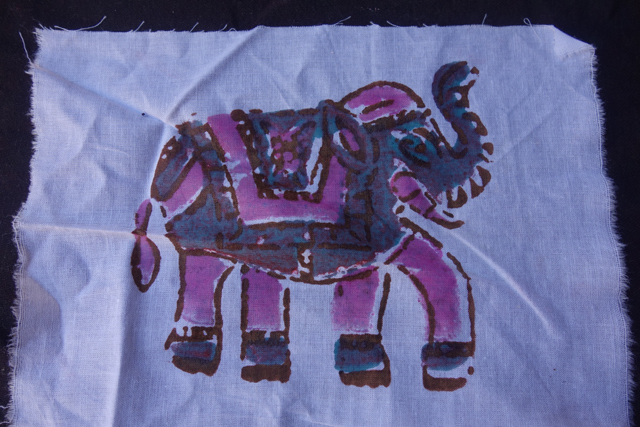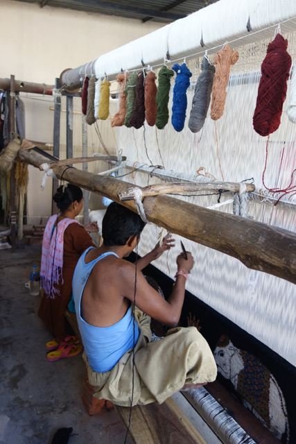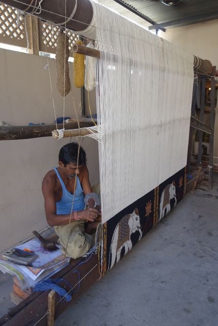 不敢回嘴的我隨他開去後,那邊工人特別停下手邊工作,示範給我看,原來是拿著木頭印章在長布上蓋出連續花紋,要對得很準,不然整塊布就前功盡棄。工人們當然都很熟練,但當拿出一小塊布要我試玩,就立刻被我毀了,三層不同部位不同顏色的大象每層都歪了一點,我感覺大象流下了眼淚。挫折之後,我順便看了一旁的地毯編織,一男一女不需圖樣就能飛速把色線纏剪纏剪堆疊下去,相當神奇。