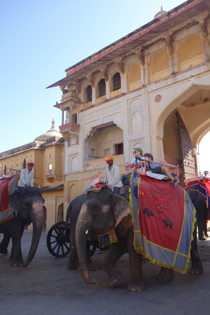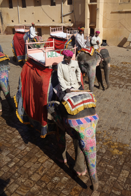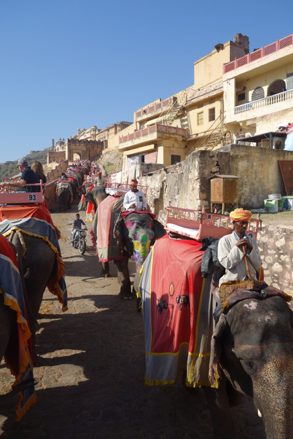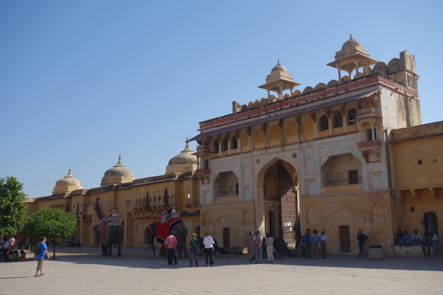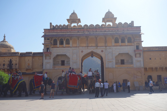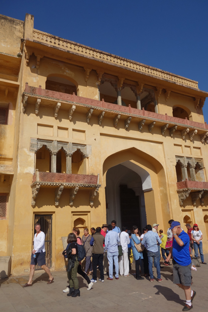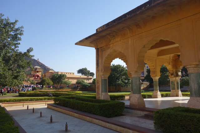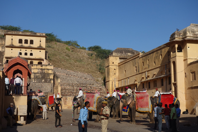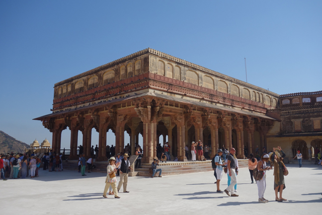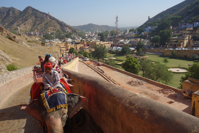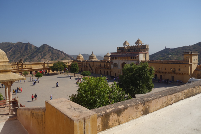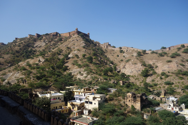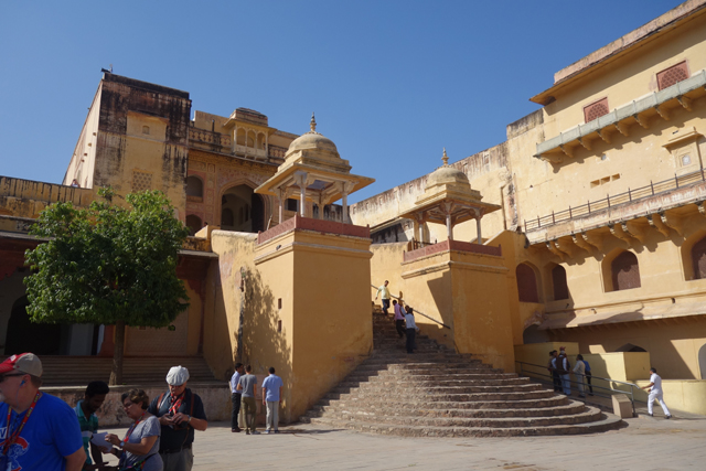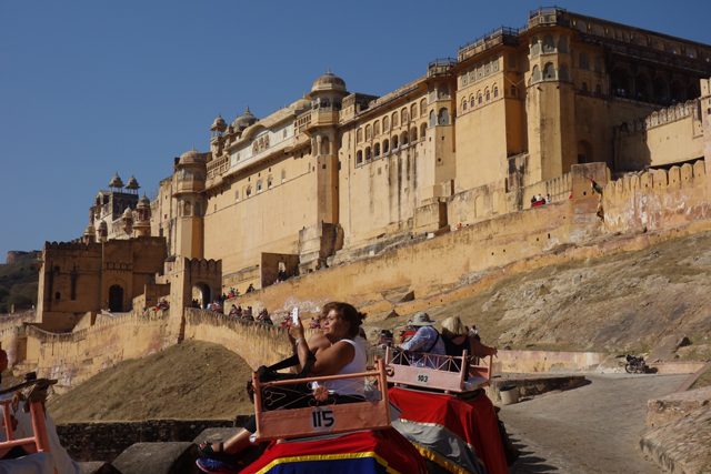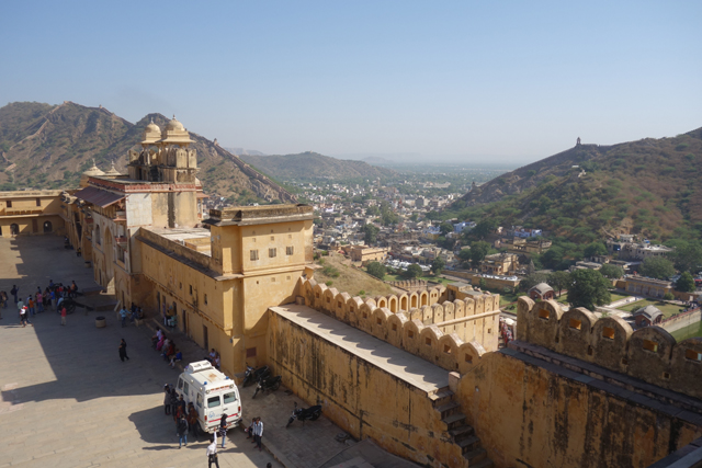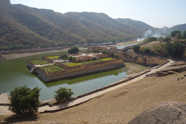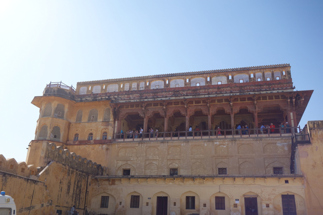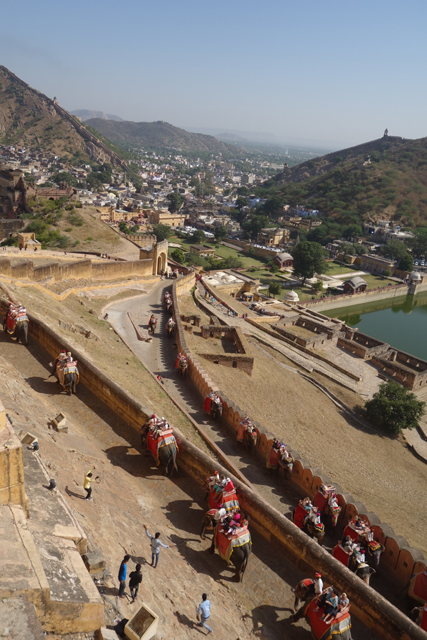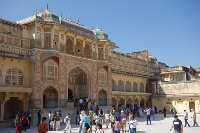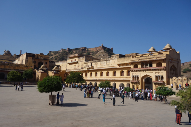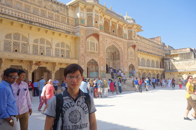 不知是不是巧合,這次的印度遊,每個大城都有座龐然主堡,而身為「拉賈斯坦邦」首府的「齋浦爾」,也有個列名世界文化遺產的「琥珀堡」(Amber fort)屹於山頭。但再想了想其實也挺合理,這字面意義為「國王之地」的「拉賈斯坦」(Rajasthan),早年就是小國林立,爭戰不休,之後又有伊斯蘭勢力的入侵、蒙兀爾帝國的吞併,居住在此的「拉吉普特」(Rajput)部族若不建起高防禦力的城壘,要如何能生存下去?