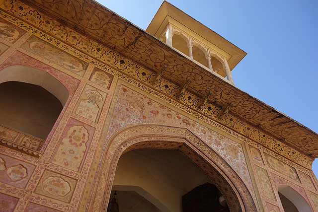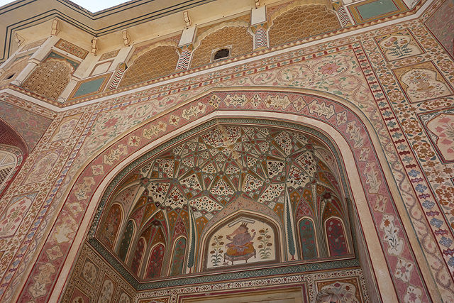 望了一陣我轉過身,走去廣場的另個焦點「象神門」(Ganesh Pol)。相較於「獅子門」,這兒的彩繪應有經過精心修復,呈現亮麗的色調,各樣圖騰成帶團圍,併接的飾框裡有姿態不同的瓶花,空餘處則攀滿藤蔓,春意盎然。門口的拱狀空間為視覺焦點,散射星芒綴著多彩菱紋,中處是象神高坐於百花間。