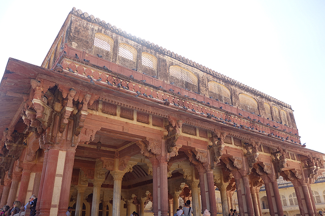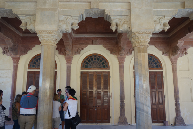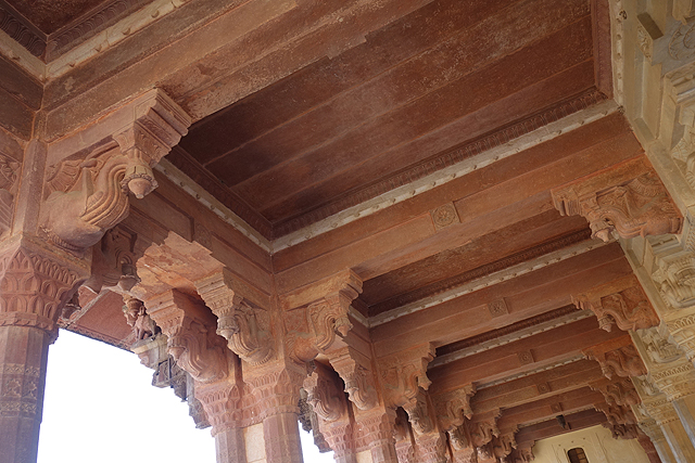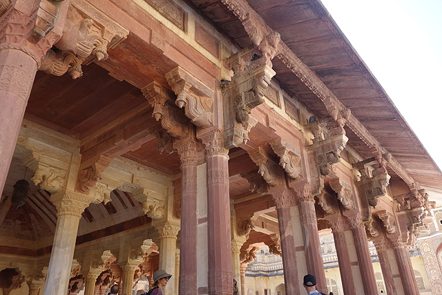 應該是制規了吧,幾天走來,每個王城幾乎都設有這樣建物,頻繁到我連原文都記得了,而這兒的除了供大君與民眾交流,還是慶典舉行的場所,譬如大君生日,或是緣由自史詩「羅摩衍那」的「十勝節」。從廳外朝內望,一反王城的土黃砂岩色調,這棟特別摻用了紅棕大理石,由外至裡,紅黃比例漸轉,彷彿象徵著兩種民族文化的撞擊和混融。這樣的融合除了出現在建材,也彰顯於細部裝飾,最容易分辨的就是柱頭的撐架了。不再隱晦地只以曲扭型態表示,而是確切地勾勒出守護獸形貌,象頭長鼻挑捲著,讓繁複的柱刻多了活潑趣緻。