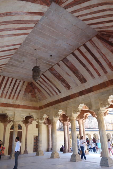 既是座山城,建築肯定隨地勢層層爬升,從「閱兵廣場」旁的長階往上,「獅子門」(Singh Pol)扼守著殿區入口,赭紅圖紋由簷下蔓生,條帶與飾框相拼接,歲月的殘褪反倒使其顯得淡雅。門道在彎拐間通抵第二重平台,將我的視線引至「公眾大廳」(Diwan-i-Am)。