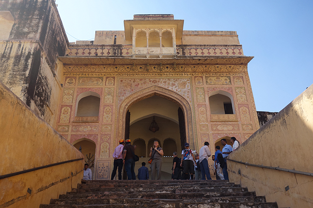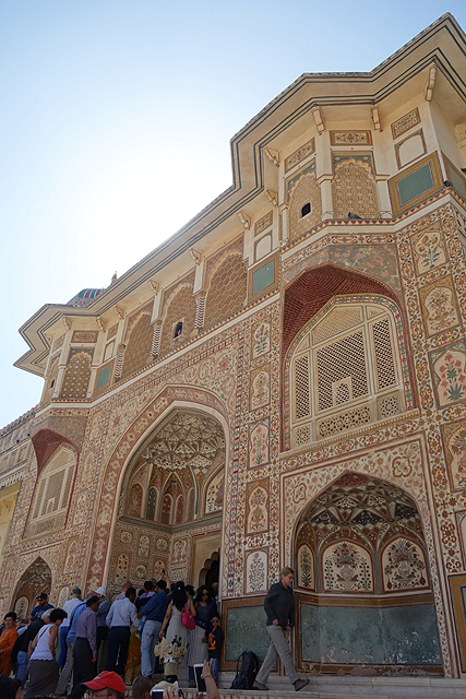 然儘管沒有俊帥的人臉,象神應該是濕婆之外,最多印度人喜愛的神吧,除了智慧與幸運,據說還能帶來財富。在這趟印度之旅中,總覺得不管到什麼店裡,都能看到他。而在「琥珀堡」,也因他能預知並移除災劫,被敬奉於內宮大門。原本我想好好將全景拍下,左看右等,才發現是件不可能的任務。身為內外宮的要道,本就人流穿梭不斷了,它的華麗炫眼更招著每個觀光客都想與它留念,所以結局可想而知,我只能降低標準,把群眾當成是它原生的紋繪。