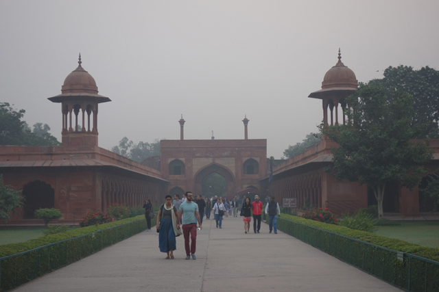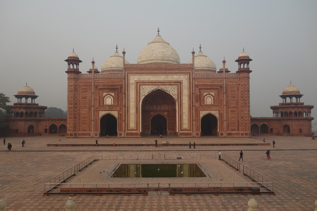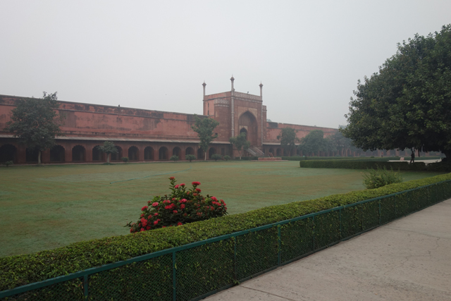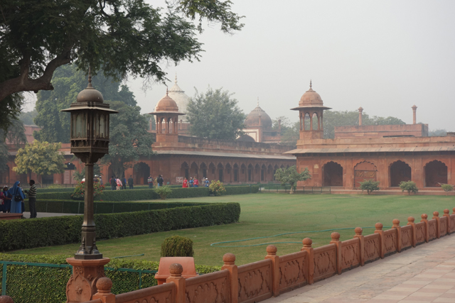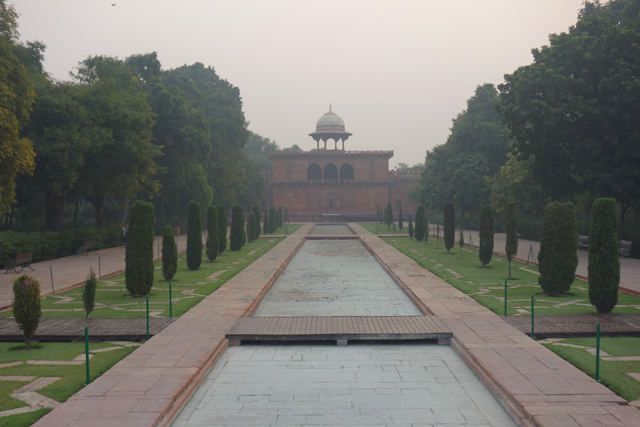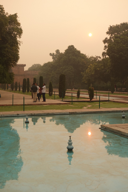走下望台,步道縱橫,將花園對稱切割,不過多數人自是沿著水道兩側,視線緊縛著主殿,直直前行。一般蒙兀爾陵寢的設計,主殿皆為置中,水道四方放射,這兒卻不太一樣,花園中心是另個砌高的望台,嵌著名為「多福」的方池。我走了上去,左右步道的盡頭各有一座磚紅建築,根據地圖標示,其一藏了個小博物館。而在這時,終於見到太陽露臉了,曦光微微灑落,將本來略顯冷寒的各個建築,一點一點抹上溫黃的色澤。