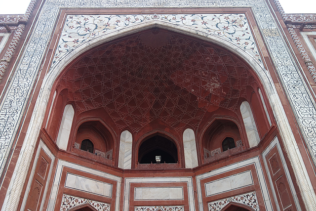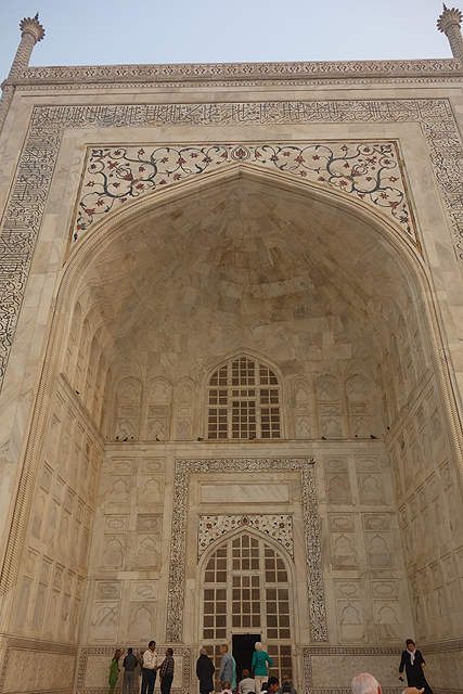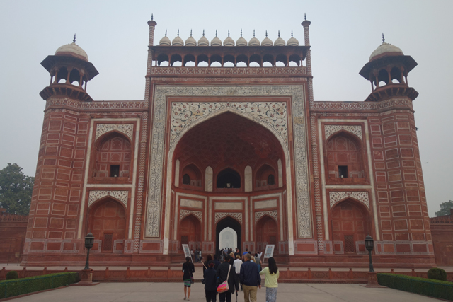 陵寢的入口在南側兩端,順著長長步道往前行,能見對面也有一批人潮在南內門前轉向,放慢步伐抬望。相較於沿途的幾個側門,這棟門樓壯偉許多,蒙兀爾風格的紋飾亦讓它顯得絢美,隨拱框攀繞的花藤、有著書法藝術的長帶,自然門頂也有熟悉的「Chhatri」帽冠飾亭作點綴。不過都來了這裡,大夥心繫的,自是早印在腦中的雪色畫面,於是幾眼望過拍過,皆又加快步伐,朝南門穿進。
