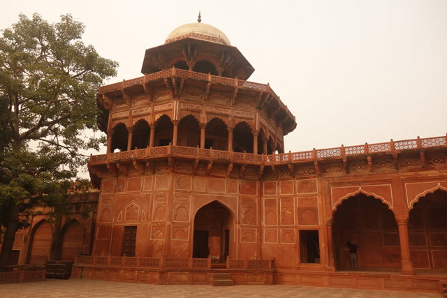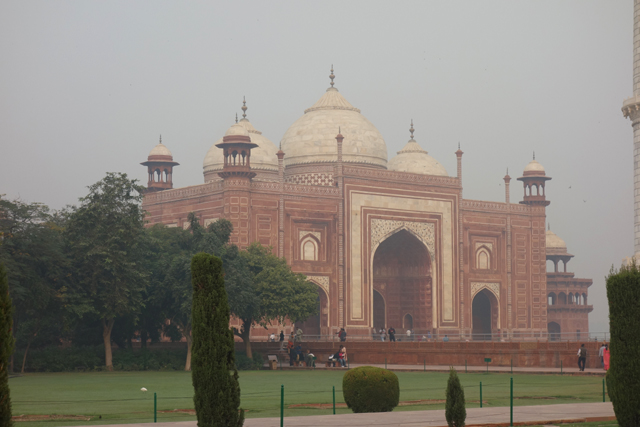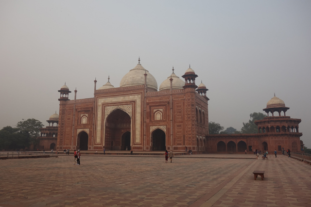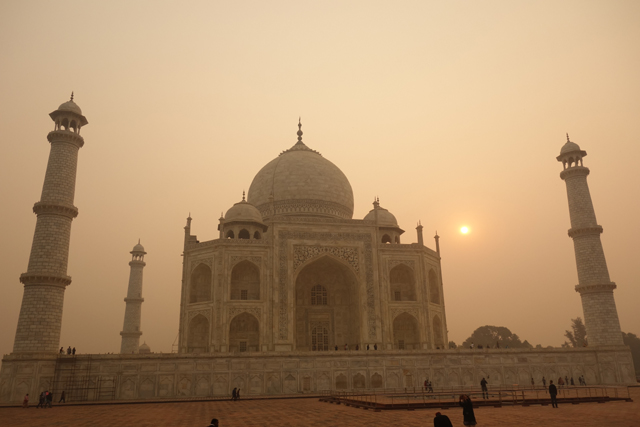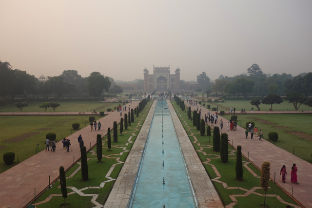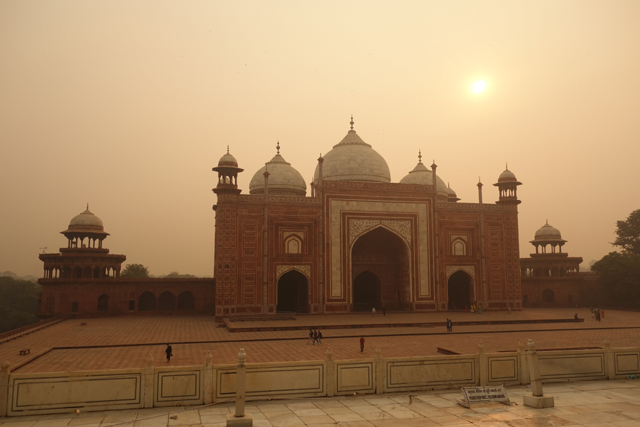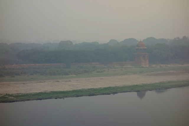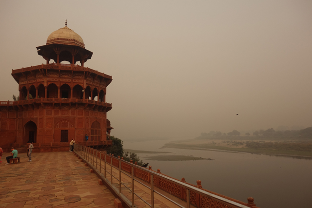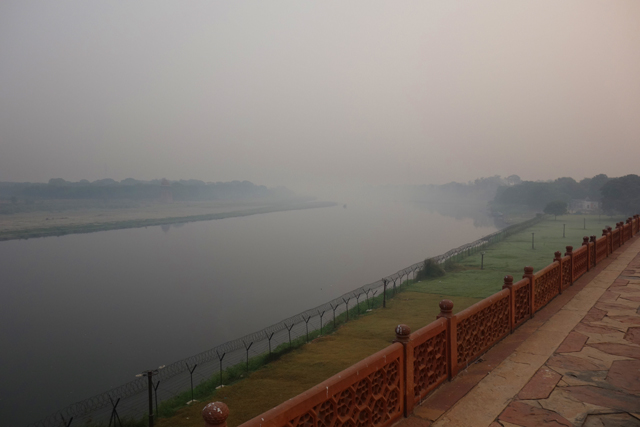 在這個方位,總算略略感受了陵寢日出,因為爬升的太陽剛好綴在主殿塔冠邊側,霧霾也柔和了旭芒,篩出很適切的溫婉光照,讓人不由得抬眼定望。除此之外,不遠處便是「亞穆拉河」,濛濛渺渺中依稀可見河的對側,也就是昨日我曾衝進匆匆一瞥的地方。那片區域被命名為「月光花園」(Mehtab Bagh),在「沙賈汗」原本的設計裡,大河為軸,對岸會有他自己的黑色陵寢,以一模一樣的形貌規制,與「泰姬瑪哈陵」月月年年隔河相望。不過在「沙賈汗」被兒子囚禁後,這規劃便只能是個無法完成的夢想了,眼下可見的河岸花園一片枯褐,蒼蒼茫茫,頗令人唏噓。