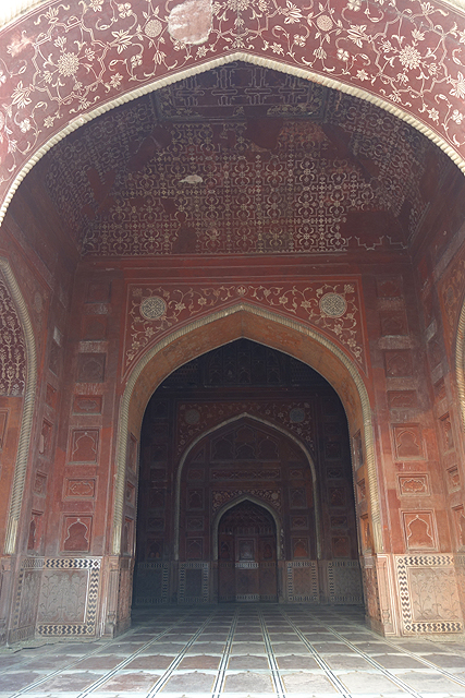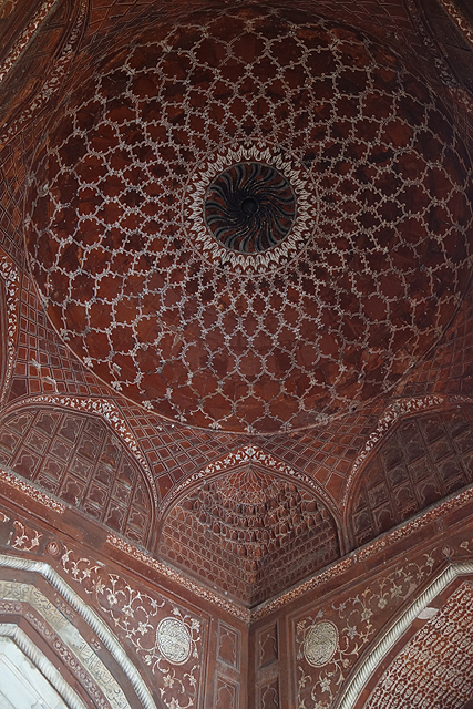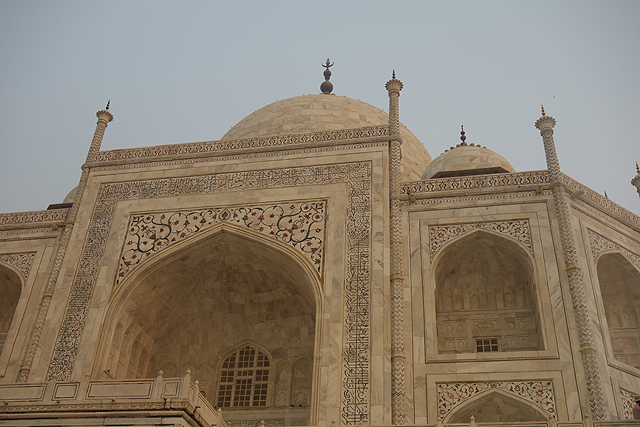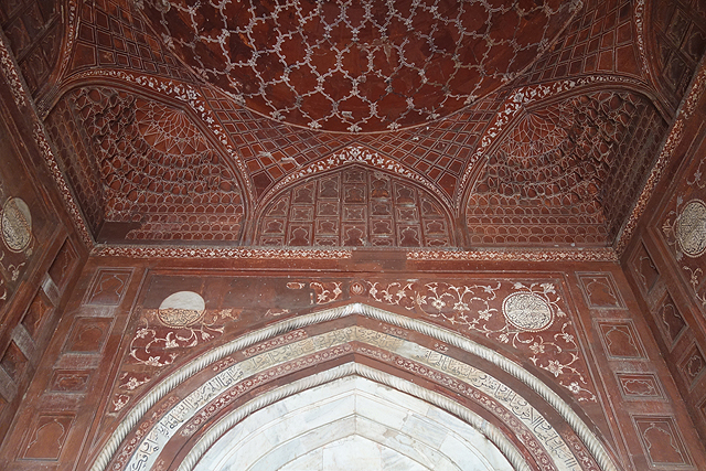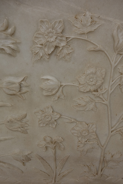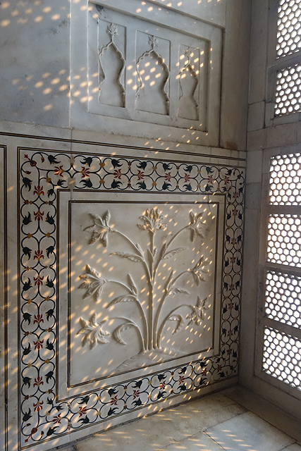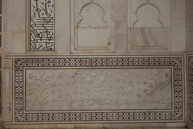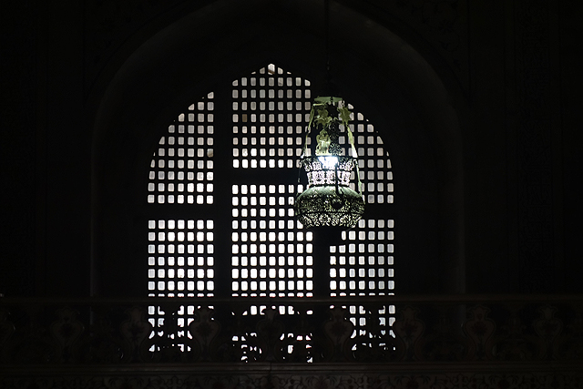 我隨著人群繞廳中走,精緻雕鏤的隔屏圍著兩個象徵棺塚,側處是「沙賈汗」的,正中自屬於陵寢主人「慕塔芝瑪哈」(Mumtaz Mahal)。「慕塔芝」原名為「姬蔓芭奴」(Arjumand Banu),由於倍受寵愛被賜了名,有著宮中翹楚之意,而那很誤導人的「泰姬」(Taj)其實是冠冕的喻指。然這種寵愛也可說是她命中的劫吧,十九年的結縭日子,恩寵讓她生了八子六女,也令她因產後體虛,染病殞命。據說由於她在臨終前求了一座世界最美的陵寢,使「沙賈汗」花了二十年的光陰、無數的民脂民膏,繼而導致之後的政變、淒涼的囚籠日子,這之間的因果環環鑲嵌,若真要論是誰的責,也很難釐得清。