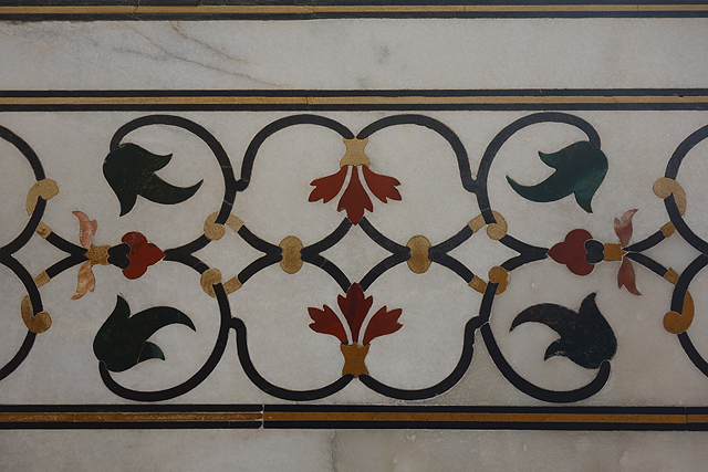 很可惜地,當進入殿內,就不准拍照了,沒法紀錄那些比外壁更精緻的雕鑿。且或許是為了文物保存,或留給故去之人寧靜,除了網窗透入的微光,能憑藉的只有盞小小的銀質懸燈。依稀的印象裡,有別團導遊以手電筒遙指,說明牆上用的不僅是彩石,還摻雜更昂貴的珠寶,資料裡也洋洋灑灑列出來自世界各地的精品,中國的玉石、西藏的綠松石、阿富汗的青金石、斯里蘭卡的藍寶石、阿拉伯的紅玉髓,便似「沙賈汗」竭盡所能地蒐羅,只為愛妻最後的心願。