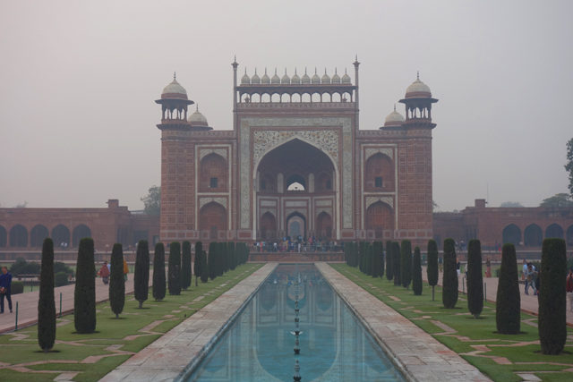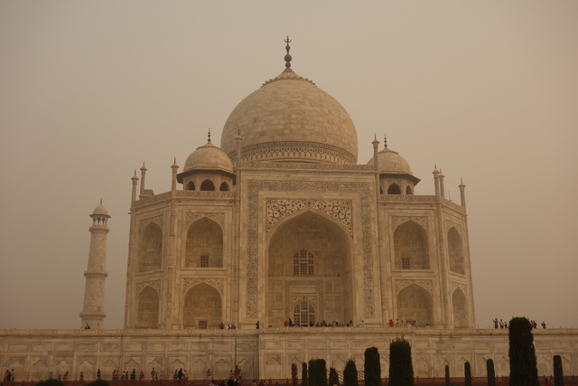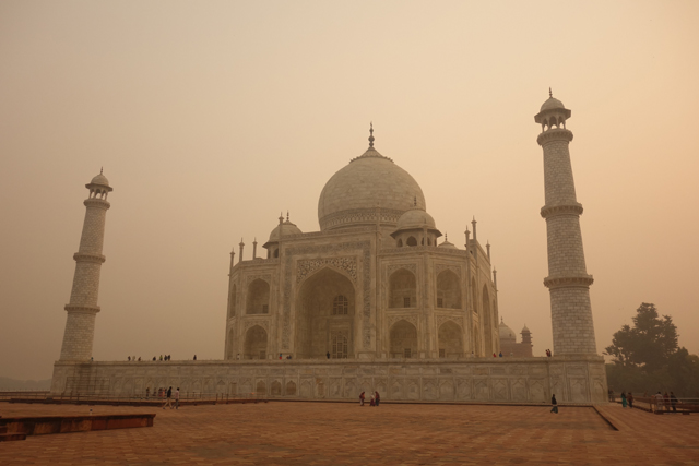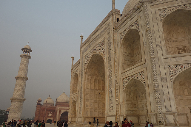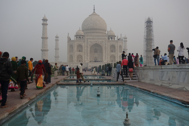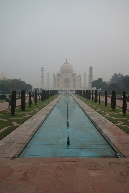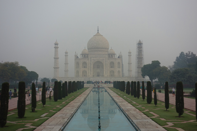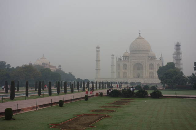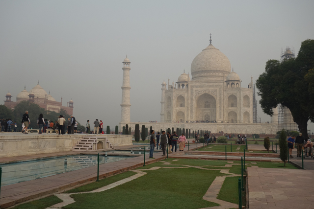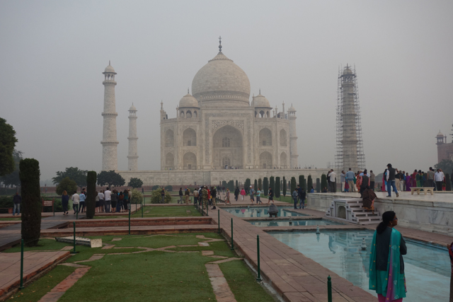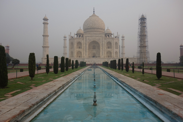 一夜過去,今日最主要的行程是「泰姬瑪哈陵」(Taj Mahal),它不僅列名世界文化遺產,也是早年我對印度僅有的認識,雖然規劃時洋洋灑灑串上各樣景點,最期待的還是這兒。誰知當跟旅行社大致談定時,卻在網路看到一張「泰姬瑪哈陵」的近照,照片裡鷹架攀爬,灰灰綠綠的網布包得到處都是,登時令我像被雷劈到。是怎樣,美人遲暮正在進場維修嗎?會整到何時?