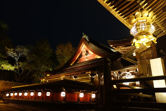乘著公車一路向北,櫻花季那時是借道「上七軒」從「東門」穿進,因此這回倒是初次與主參道的巨偉鳥居相見。秋末傍晚日落得早,還未六點,參道已呈一片暗闃,僅以昏黃路燈與石燈籠引著路。再往內走到了「樓門」,雙層疊架的它依舊壯偉高踞於階台,銀亮的綴色被暈染得金橙,現顯著不一樣的華美風貌。