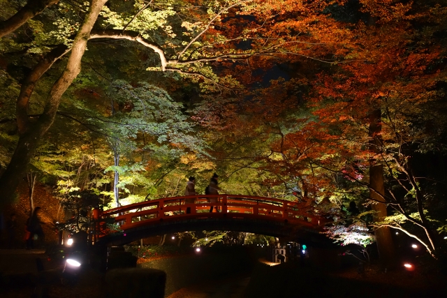 望著旁楓接起火苗,在光映中灼為金亮,我們緩緩行到了「本殿展望所」,在這兒,能見本殿屋閣連綿,直至幽夜隱微處。櫻花季時曾在廊間穿繞,周遭屋稜有跌宕的美感,此刻則因土堤地勢拔高,讓我得以循著簷脊,看它藉山牆紋刻的輝華、懸燈的炫熾,呈現另番華麗風姿。