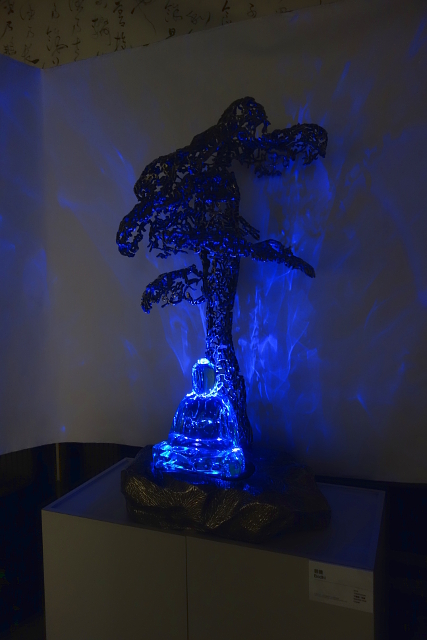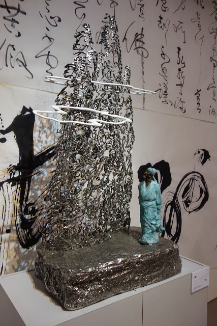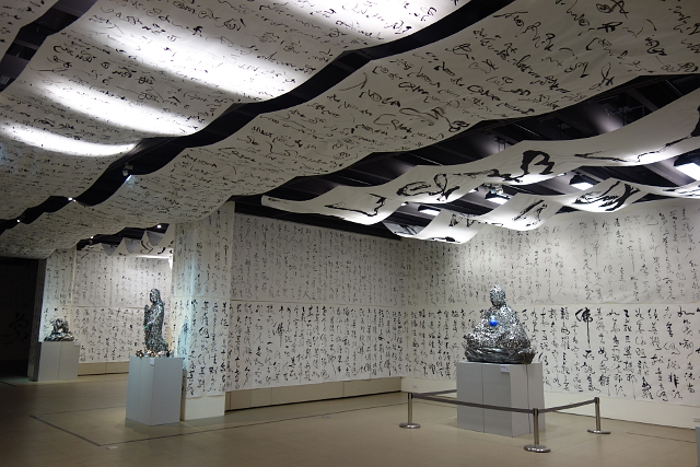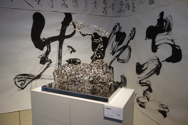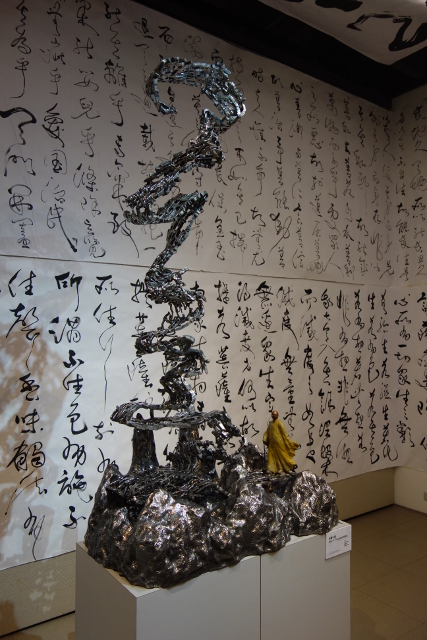 廳內滿滿龍飛鳳舞的草書,如簾如幡,而一尊尊金屬鏤雕的作品散置其中,